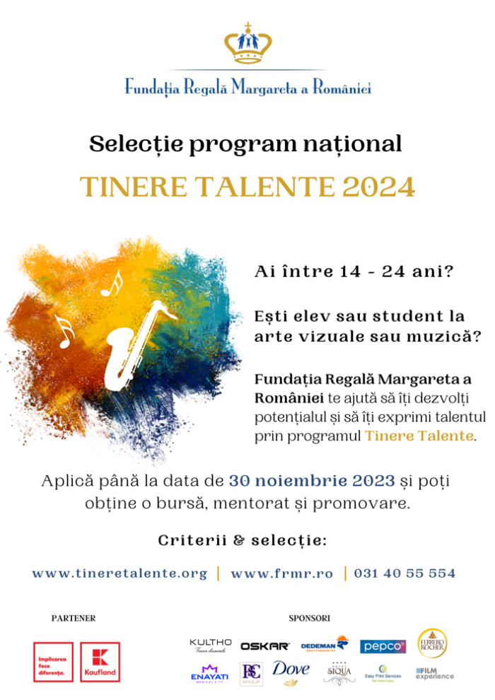 Fundația Regală Margareta a României lansează selecția națională pentru programul de burse Tinere Talente 2024. Candidații pentru bursele Tinere Talente trebuie să îndeplinească următoarele criterii de eligibilitate: 1. să aibă vârsta cuprinsă între 14 și 24 de ani 2. să studieze la liceele sau universitățile de artă vizuală și muzică din România 3. să provină…