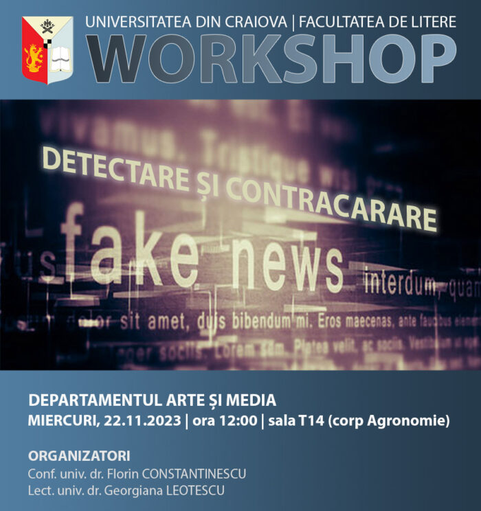Miercuri, 22.11.2023, între orele 12.00-14.00, la sala T14 de la Departamentul Arte și Media (corp Agronomie) va avea loc workshopul „Fake news – detectare și contracarare” susținut de conf. univ. dr. Florin CONSTANTINESCU și lect. univ. dr. Georgiana LEOTESCU. Sunt invitați studenții de la specializările Cinematografie, Fotografie, Media și Comunicare.