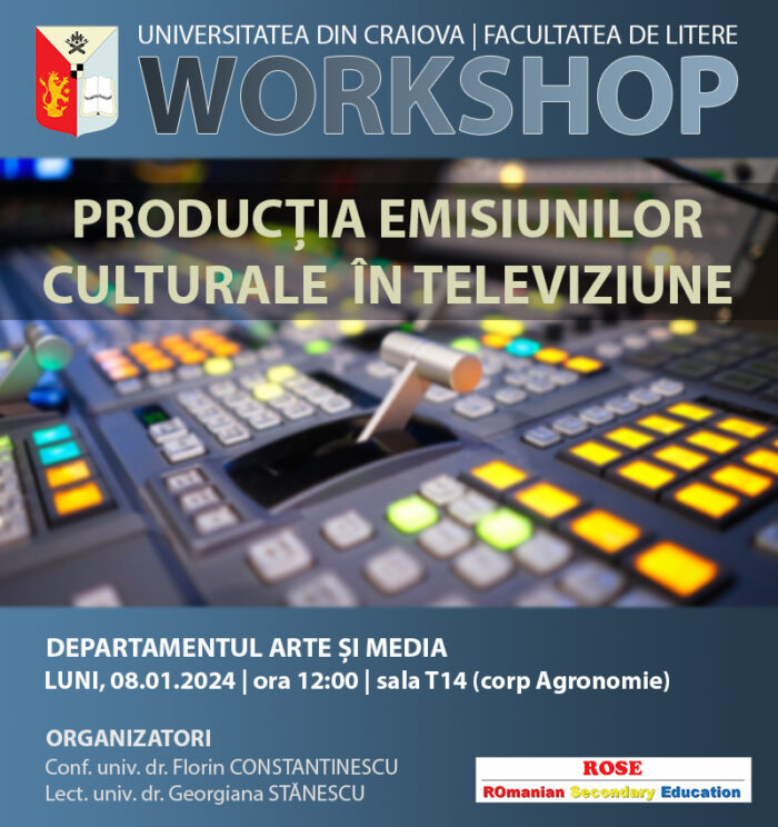Luni, 08.01.2024, între orele 12.00-14.00, la sala T14 de la Departamentul Arte și Media (corp Agronomie), în cadrul programului ROSE, va avea loc workshopul „Producția emisiunilor culturale în televiziune” susținut de conf. univ. dr. Florin CONSTANTINESCU și lect. univ. dr. Georgiana STĂNESCU. Sunt invitați studenții de la specializările Cinematografie, Fotografie, Media, Jurnalism și Comunicare și…