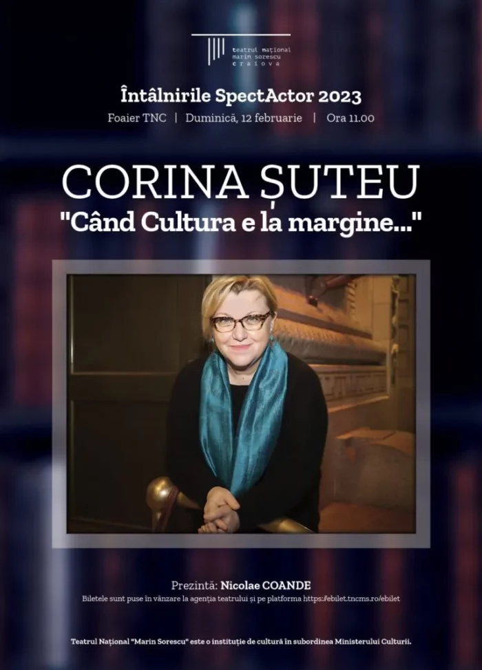 Primul invitat al Întâlnirilor “SpectActor 2023” este Corina Șuteu, teatrolog, manager cultural, ministru al Culturii (2016-2017), director al ICR New York (2006-2012). Aceasta va susține, duminică, 12 februarie, de la ora 11:00, conferința “Când Cultura e la margine…” urmată de un dialog cu publicul prezent. Prezintă Nicolae Coande. “Aflată întotdeauna, aparent central, în discursurile politicienilor, cultura este,…