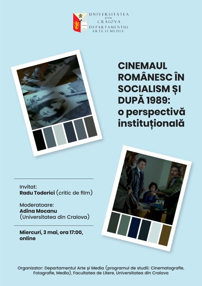 Miercuri, 3 mai, ora 17:00, criticul de film Radu Toderici va ține un seminar cu titlul „Cinemaul românesc în socialism și după 1989: o perspectivă instituțională”, în cadrul programului de studii Cinematografie, Fotografie, Media (Comunicare audiovizuală: scenaristică, publicitate media, filmologie) Radu Toderici este cercetător și predă la Facultatea de Teatru și Film a Universității Babeș-Bolyai…