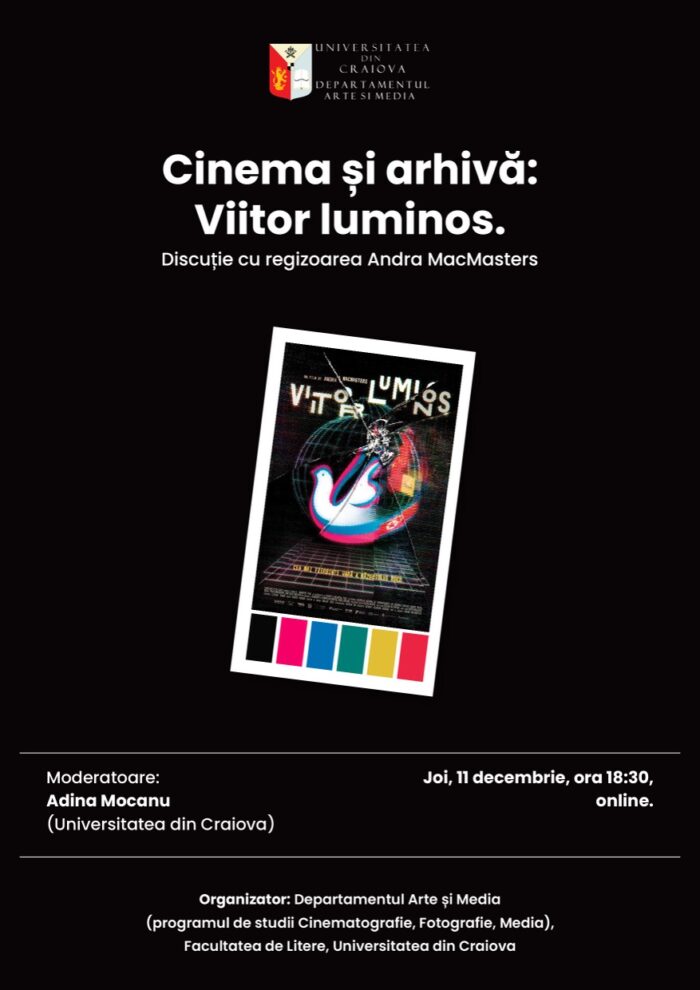 Cinema și arhivă: Viitor luminos. Discuție cu regizoarea Andra MacMaster Joi, 11 decembrie, ora 18:30, online va avea loc o discuție cu Andra MacMaster, realizatoarea filmului documentar „Viitor luminos”. Filmul este construit exclusiv din imagini de arhivă de pe casete VHS care au aparținut cineastului amator Emilian Urse, filmate la sfârșitul anilor ’80, în timpul…