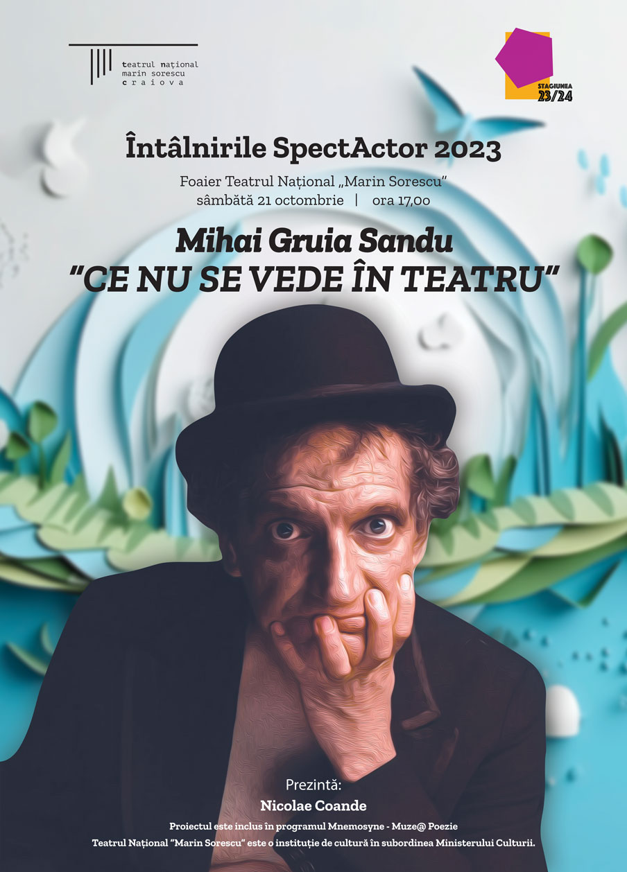 Invitatul Teatrului Național „Marin Sorescu” la „Întâlnirile SpectActor” stagiunea 2023-2024 este Mihai Gruia Sandu, actor, profesor universitar doctor la Universitatea Națională de Artă Teatrală și Cinematografică „I. L. Caragiale”. Dl Mihai Gruia Sandu va susține sâmbătă 21 octombrie, ora 17,oo, conferința „Ce nu se vede în teatru”. Prezintă, Nicolae Coande. Întâlnirea are loc în foaierul teatrului. Biletele se găsesc la agenția…